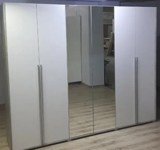 Шкаф имеет шесть дверей, которые обеспечивают легкий доступ ко всем вашим вещам. Внутреннее наполнение шкафа тщательно продумано – отделение для вешалок, полки для складирования белья, выдвижные ящики для аксессуаров. Материал изготовления – высококачественная ДСП, гарантирующая долговечность и надежность конструкции.