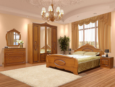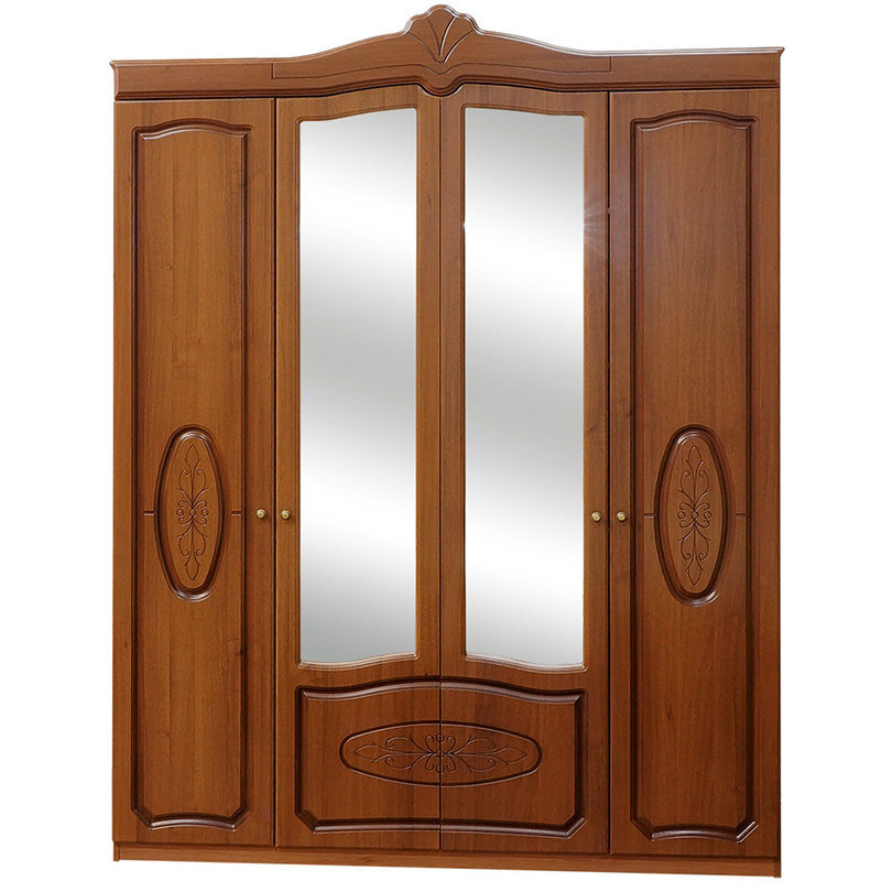 Шкаф "Катрин" оснащен четырьмя дверями, что обеспечивает удобный доступ к содержимому. Внутреннее пространство разбито на разные секции или полки, что позволяет организовать хранение предметов по вашим потребностям. Например, одежду можно разместить на вешалках или полках, а аксессуары – в выдвижных ящиках.