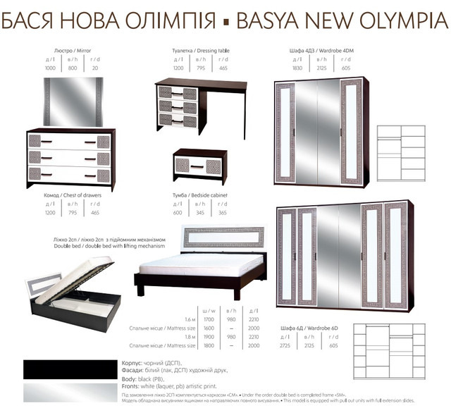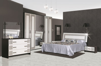 Неотъемлемой частью спальни есть шкаф с шестью дверями, размер которого составляет 2725 на 2125 мм, а ширина – 605 мм. Корпус шкафа выполнен в черном цвете из ДСП, что придает ему стойкость и долговечность. Фасады шкафа изготовлены из белого лакированного ДСП с художественной печатью, что придает элегантности и оригинальности дизайн.