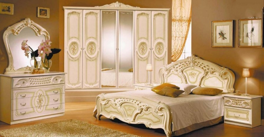Новая коллекция включает в себя: тумбу с размерами 530*485*400мм, люстру размерами 1000*1090*75мм, кровать с двуспальным спальным местом размером 1820*1250*2120мм, шкаф с шестью дверьми3м2 *820*495мм.