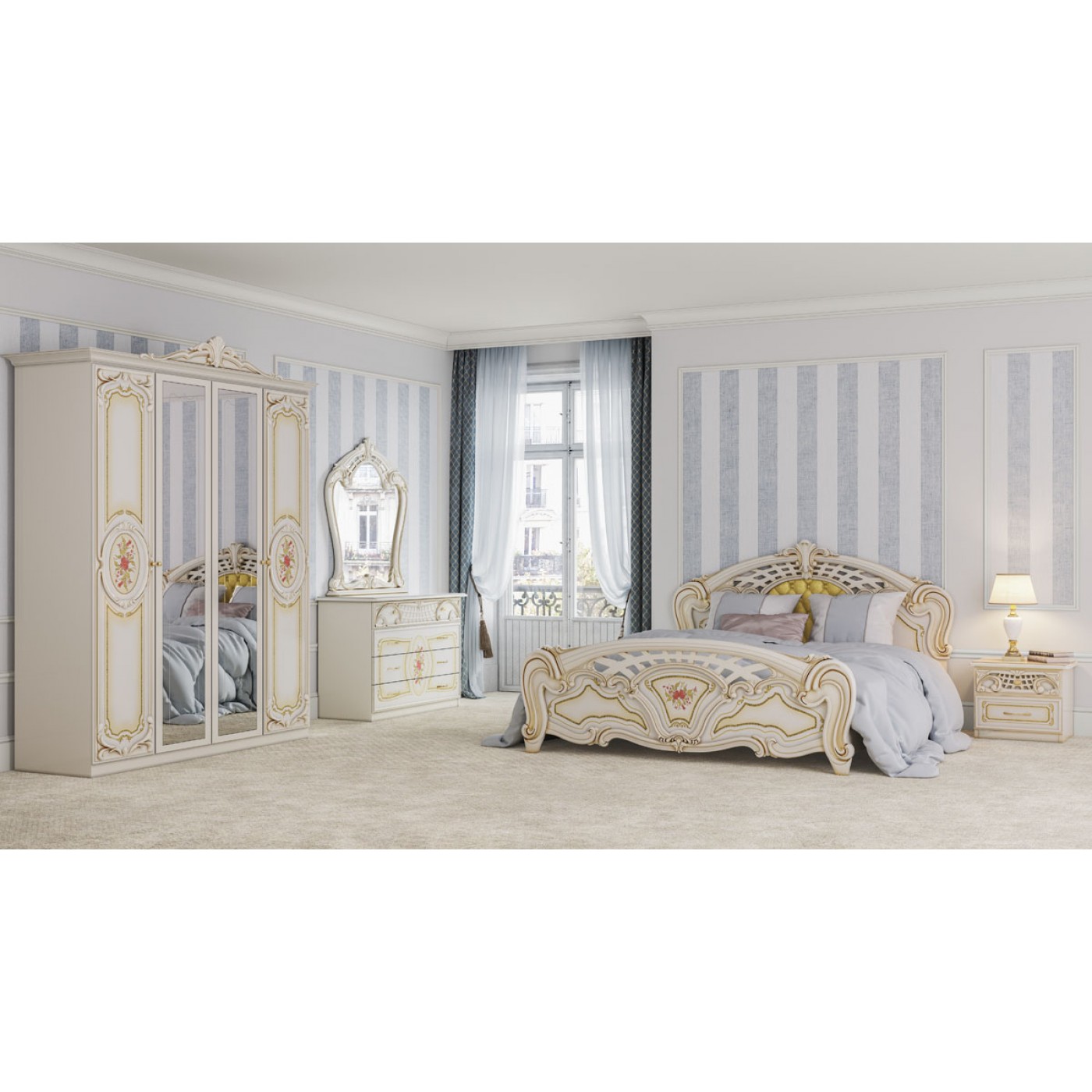 Комод размерами 1200х820х495 мм и шкаф 6Д размерами 2800х2320х645 мм обеспечивают достаточно места для хранения вашей одежды и вещей. Туалетка размерами 1435х820х495 мм и тумба размерами 530х485х400 мм дополняют интерьер и создают комфортную зону по уходу за собой. Люстра размером 1000х1090х75 мм придает роскошь и стиль комнате.