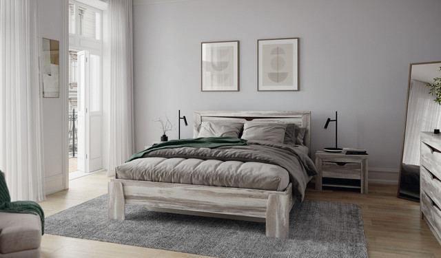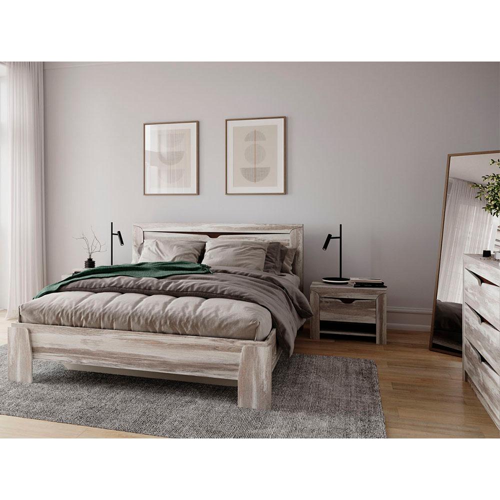 Прикроватная тумба размером 610мм х 450мм х 390мм и комод размером 1070мм х 825мм х 430мм дополняют интерьер спальни.
