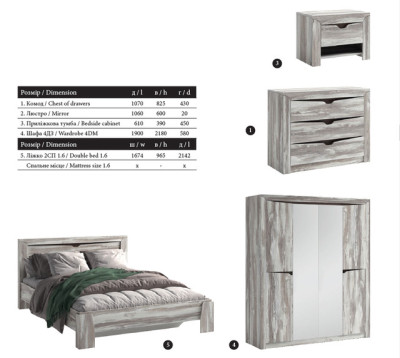 Спальня "Соломия" – это воплощение современного дизайна и функциональности. Главный элемент – кровать с двумя спальными местами размером 1616 мм х 965 мм х 2142 мм, со спальным местом 1600 мм х 2000 мм, что обеспечивает комфортный сон.
