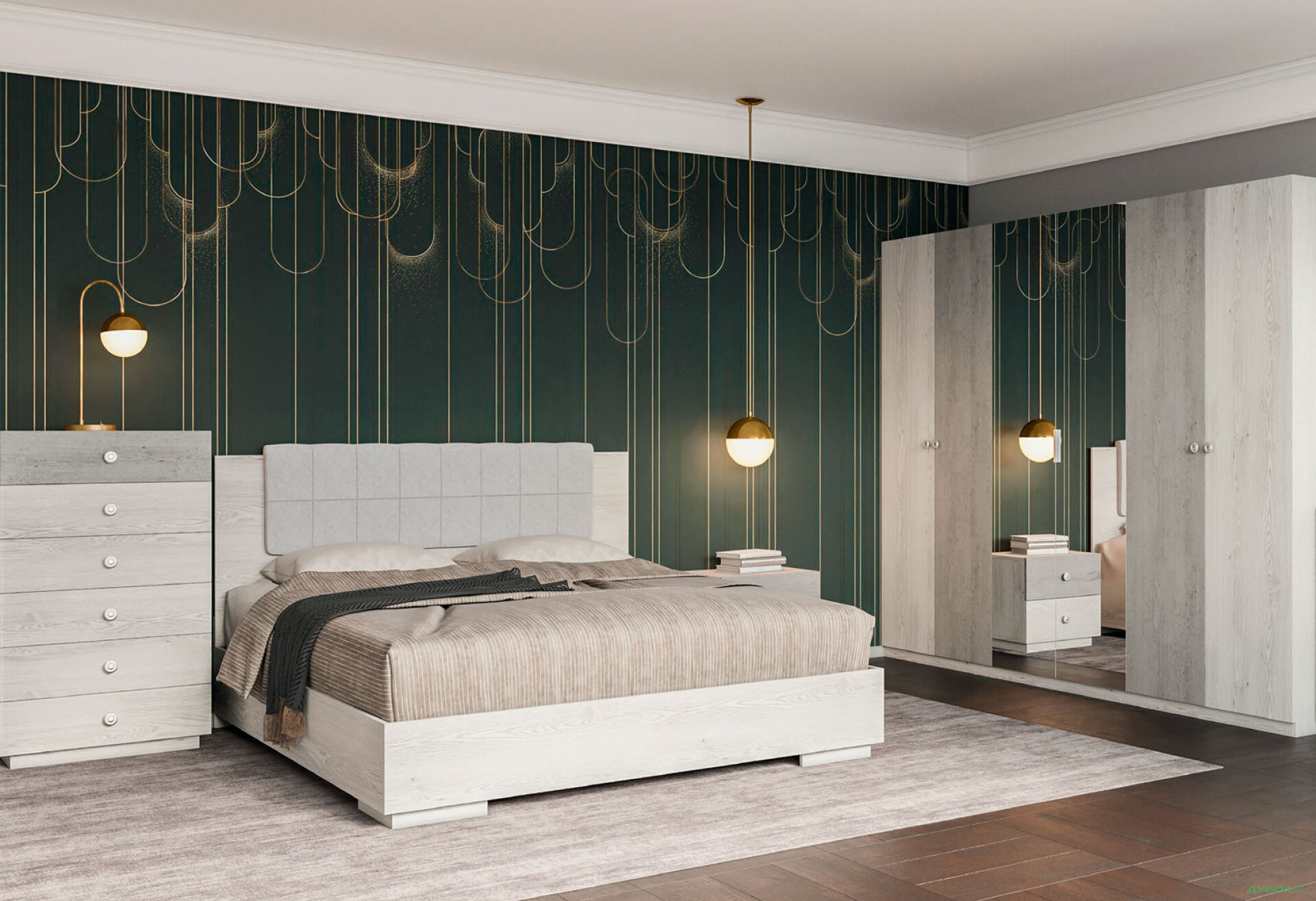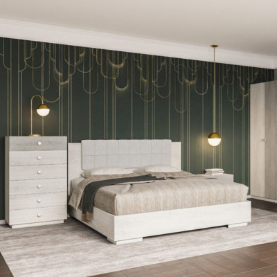 Корпус выполнен из светлого артвуда (ДСП), фасады – сочетание светлого артвуда и индастриала (ДСП). Возможность комплектации кровати каркасом "СМ". Мягкая часть изголовья выполнена из ткани.