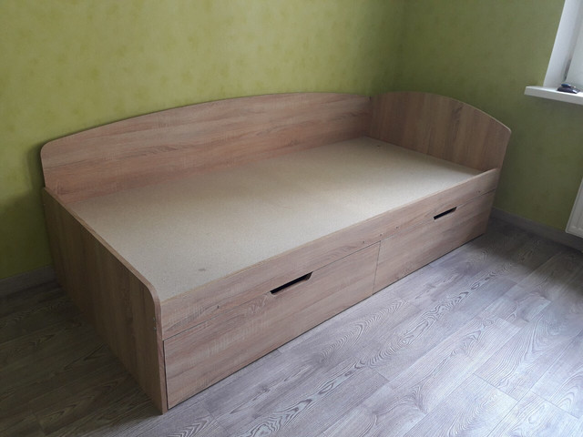 Ламинированное ДСП облегчает уход за кроватью, а ее монтажная конструкция делает сборку легкой и удобной. Кровать поставляется в разобранном состоянии, что облегчает транспортировку и монтаж.