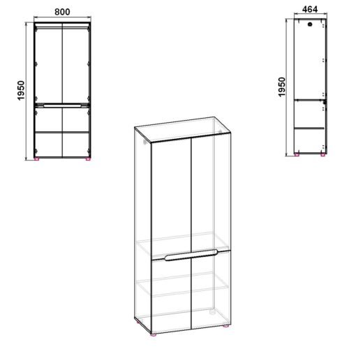 Розміри шафи були ретельно обрані для оптимального використання простору. Висота 1950 мм дозволяє ефективно використовувати вертикальний об'єм для зберігання різноманітних речей від одягу до господарських приладів. Ширина 800 мм робить шафа великим і просторовим, а глибина 464 мм надає йому компактність.