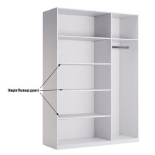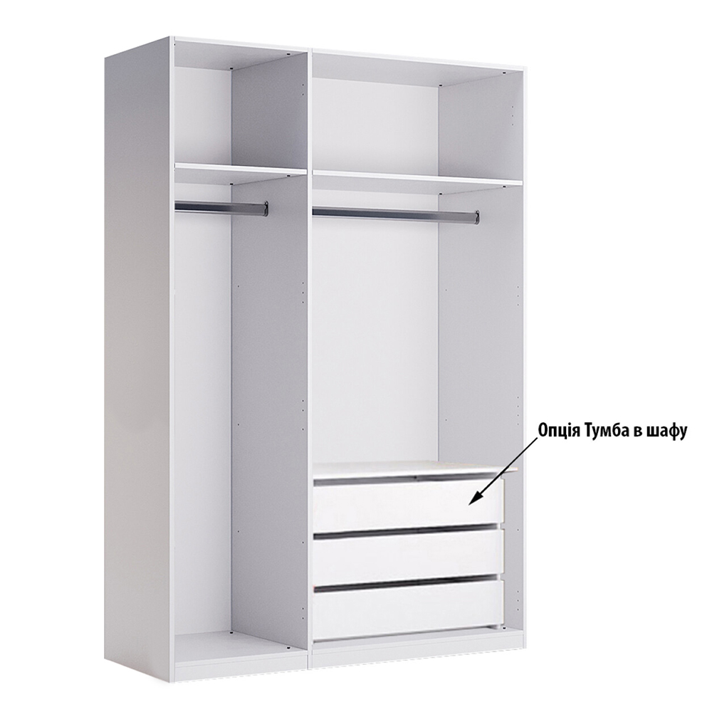 Шафа оснащений трьома дверима, що дозволяє зручно розташовувати речі і забезпечує легкий доступ до них. Корпус шафи виконаний в білому кольорі, а фасад має глянсове біле покриття, що надає шафі стильний і сучасний вигляд.
