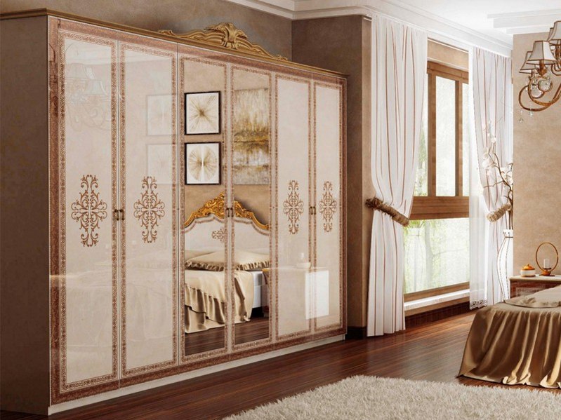 Шафа Дженніфер 6Д з дзеркалом Радика беж MiroMark прямий, класичного стилю, з висотою 2150 мм, глибиною 595 мм і шириною 2820 мм.він має шість дверей і задню стінку з ДСП. Корпус шафи виготовлений з ламінованої ДСП товщиною 16 мм, а фасад складається з трьох шарів високоглянцевого покриття, висушеного під ультрафіолетовими променями. Ламінована ДСП товщиною 18 мм використовується для виготовлення дзеркальних дверей.