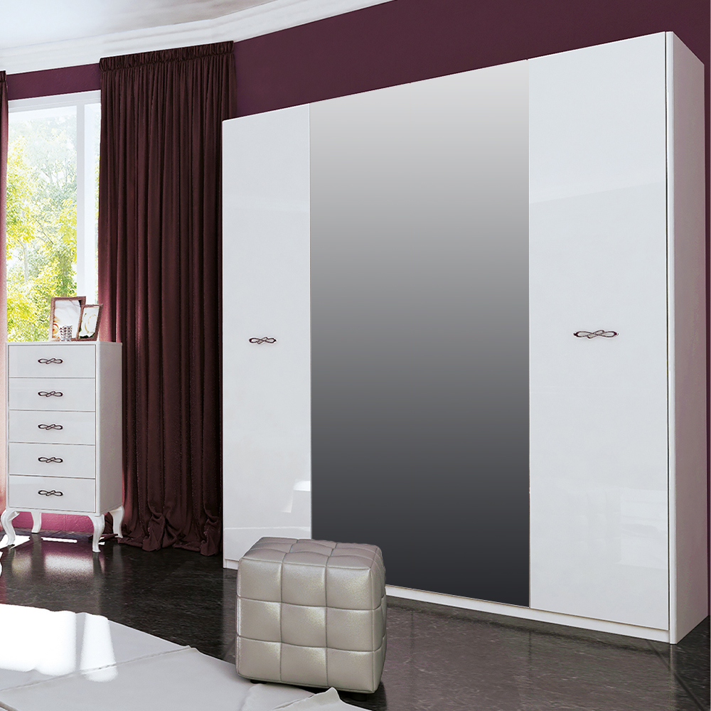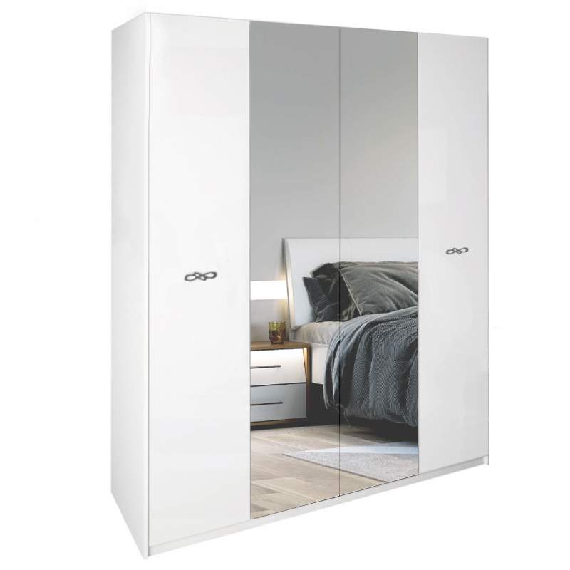 Задня стінка шафи виготовлена з ДВП. Шафа має чотири двері і виготовлений в білому глянсовому кольорі. Виробництво цієї шафи здійснюється в Україні. Корпус шафи виконаний з ламінованої ДСП товщиною 16 мм, а фасад включає в себе тришарове високоглянцеве покриття з ламінованої ДСП товщиною 18 мм, яке висушується під ультрафіолетовими променями для довговічності.