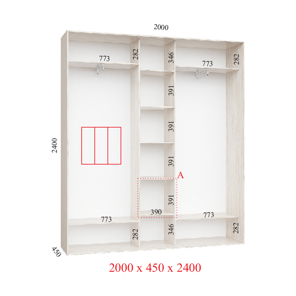 Велика висота шафи-купе дозволяє з легкістю розмістити навіть найдовші предмети одягу або особисті речі без необхідності складати їх. Крім того, такий розмір є оптимальним для більшості приміщень. Ще одним унікальним достоїнством цієї шафи-купе є його функціональність. Він оснащений 3 фасадами, що робить його ще більш зручним і доступним для використання декількома людьми одночасно.
