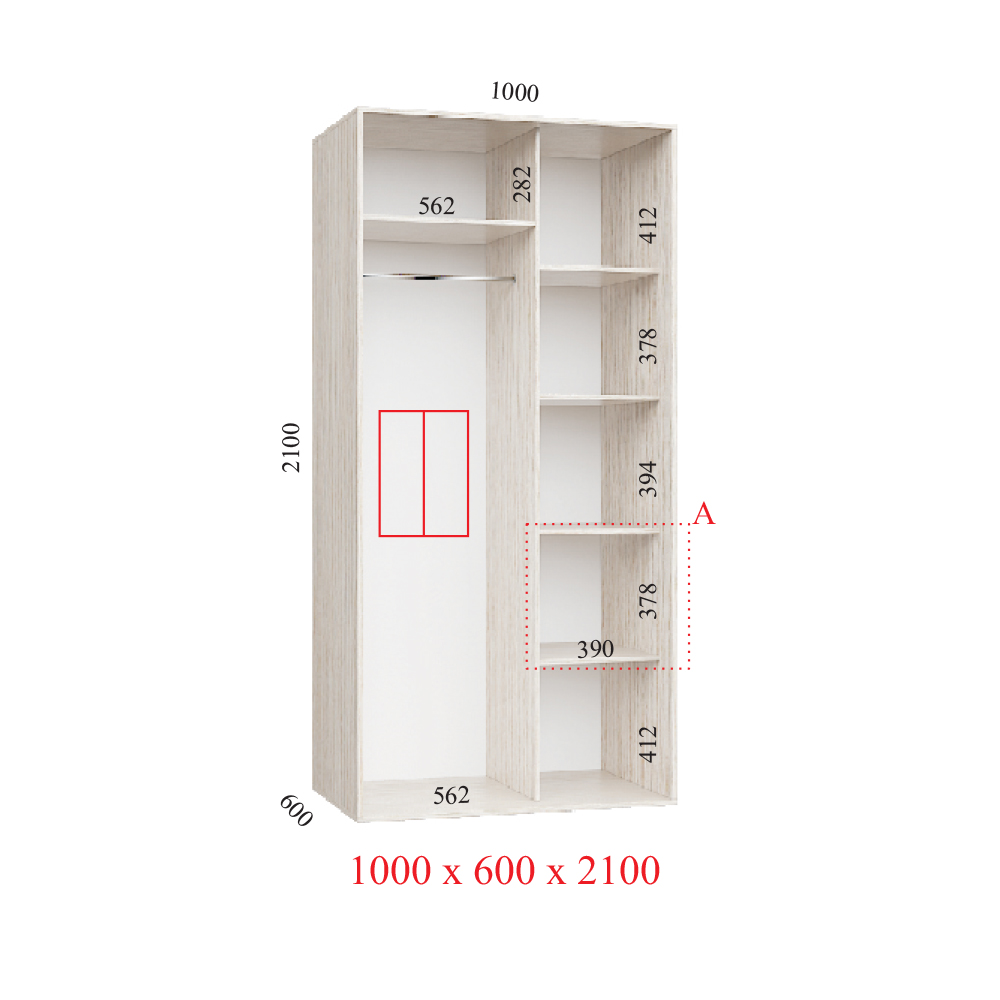 Витримуючи найвищі стандарти якості, ця шафа-купе служить не тільки функціональними меблями для зберігання одягу, але і стильним елементом декору. Поєднання габаритних розмірів 1000*600*2100 робить цей шафа-купе ідеальним варіантом для приміщень з обмеженим простором. Він легко впишеться навіть в самі компактні і невеликі кімнати, максимально оптимізуючи використання доступного місця.