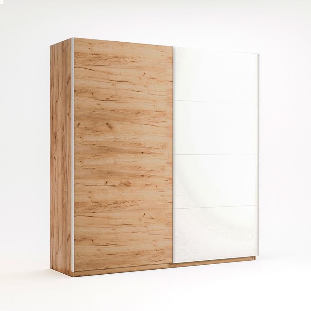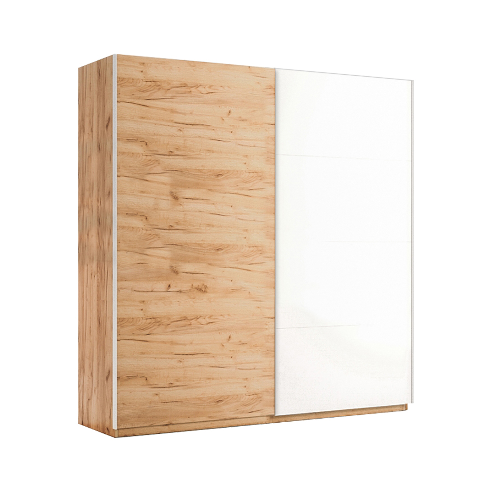 Шафа-купе Нікі Глянець білий Дуб Крафт MiroMark ширина шириною 1500 мм спеціально розроблена для використання у вітальні або спальні. Вона має двоє дверей з ДСП, які забезпечують простір для зберігання різних речей. Висота шафи становить 2115 мм, а глибина – 615 мм.