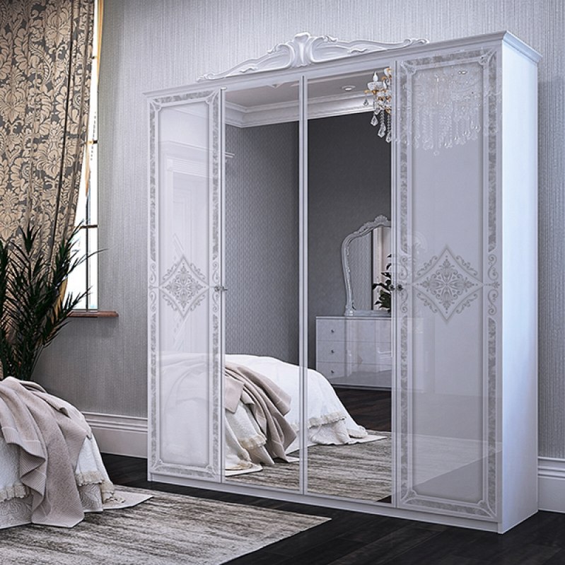 Задня стінка шафи виготовлена з ДСП, що забезпечує додаткову міцність і стійкість конструкції. Кількість дверей-чотири, що дає можливість зручно організувати ваші речі і зберігання. Шафа має білий глянсовий колір, який відмінно підходить до різних стилів інтер'єру.