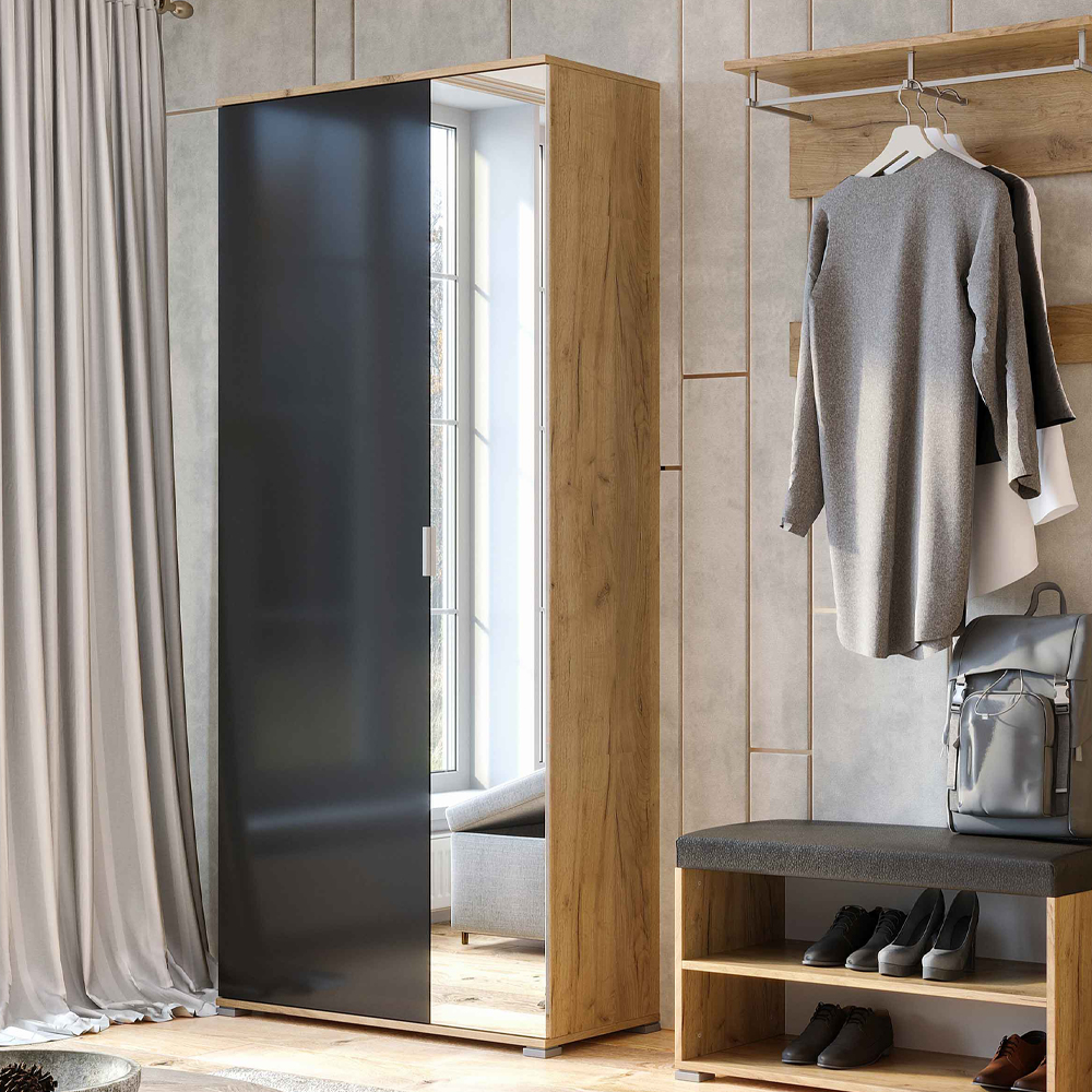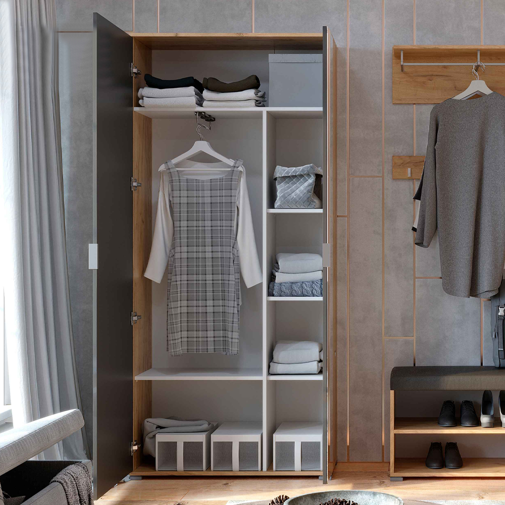 Двері шафи виконана з ДСП, що забезпечує міцність і довговічність конструкції. Одна з дверей має вбудоване дзеркало, яке створить візуальну глибину приміщення і дозволить вам швидко перевірити свій образ перед виходом з дому.