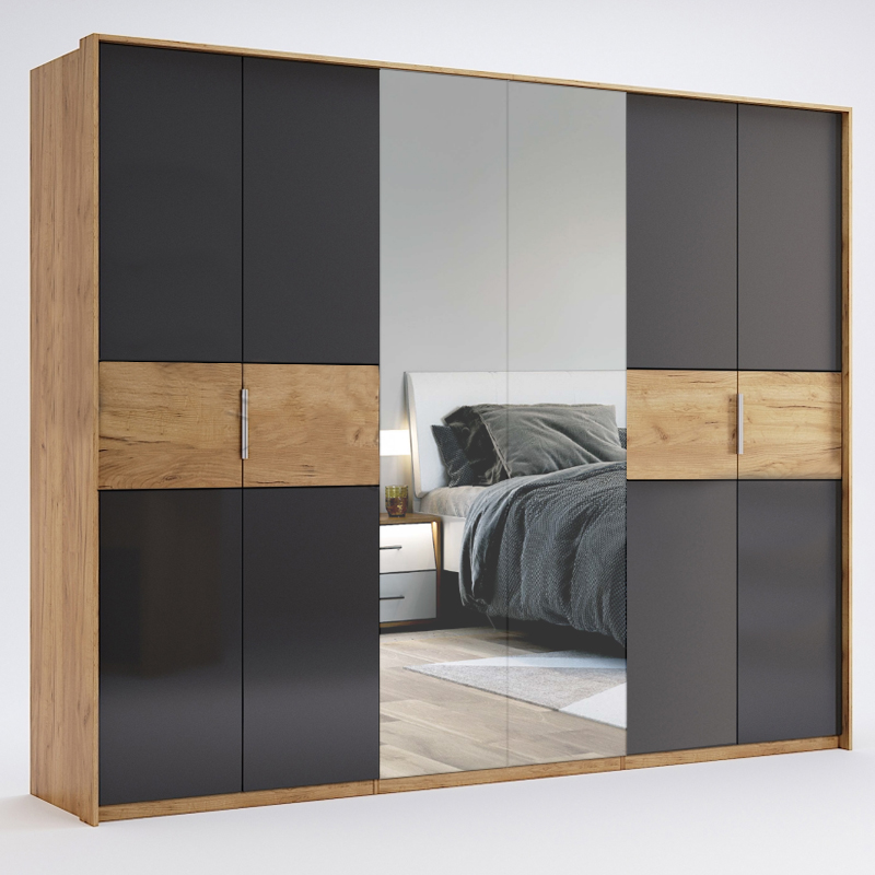 Шафа Рамона 6дв MiroMark з шістьма дверима і двома дверима з ДСП. Вона має додатково два дзеркала і два полку з ДСП. Висота шафи становить 2134 мм, а глибина – 585 мм.