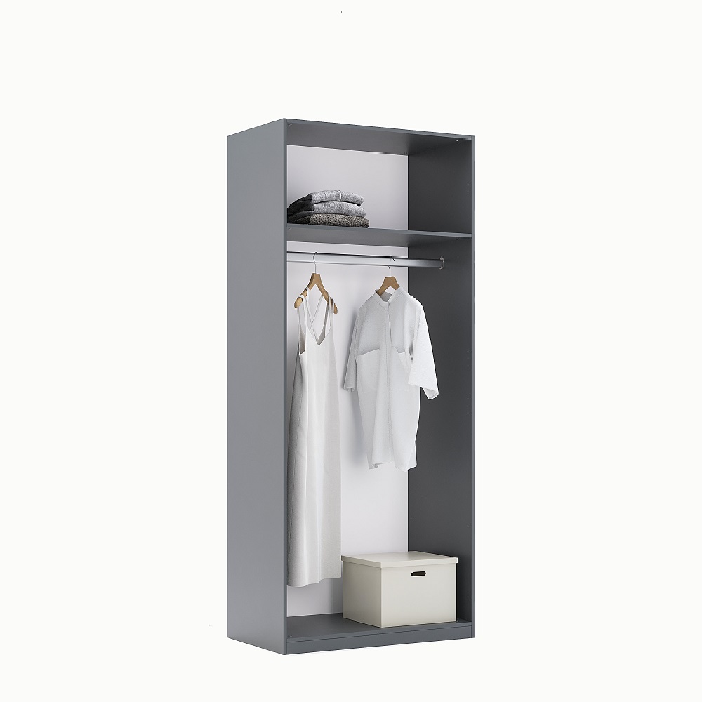Цей шафа купе не має дверей, але він оснащений трьома ящиками, які дозволяють зручно розміщувати і зберігати різні речі. Колір шафи-матовий антрацит і матовий графіт, що надає інтер'єру стильності і сучасності.
