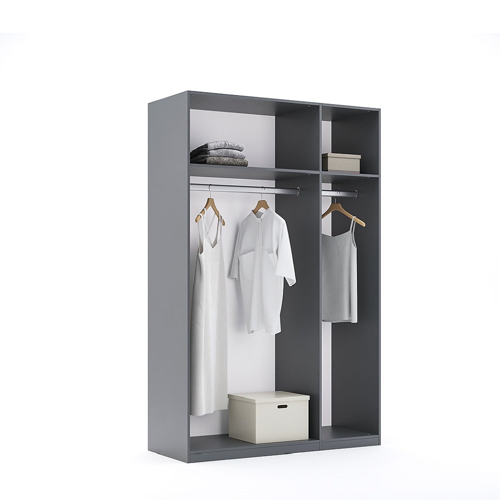 Завдяки двом дверям з матеріалу ЛДСП 16 мм, шафа купе виглядає елегантно і сучасно. Варіанти дверей включають в себе 2Д ЛДСП, які можна обробити з використанням ПВХ або меламінової кромки. Задня стінка виконана з ХДФ товщиною 2,5 мм, надаючи шафі додаткову міцність і стабільність. Її колірна гамма складається з мату антрациту і Мат графіту, що надає шафі стильний вигляд і підкреслює його сучасний дизайн.