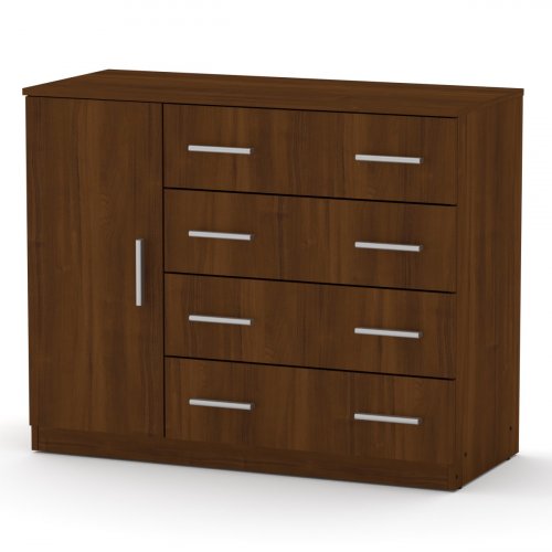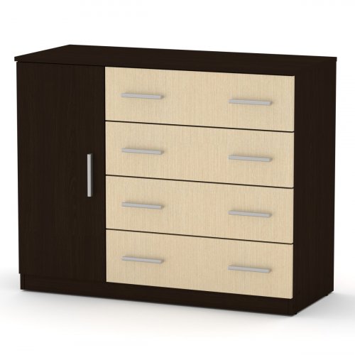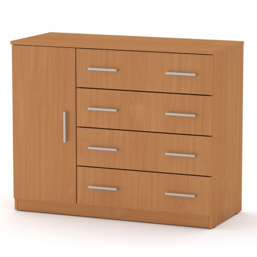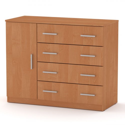 Цей комод доступний у різноманітних кольорах ДСП, включаючи бук, вільху, горіх, яблуню, дуб соному та венге. Ви можете вибрати колір, який найкраще відповідає вашому інтер'єру та особистим уподобанням.