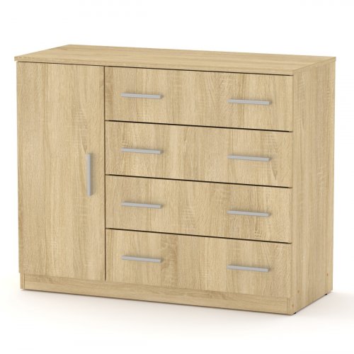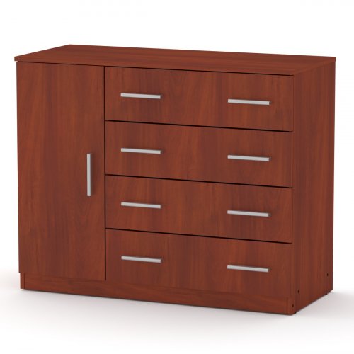 Комод-4+1б - ідеальний вибір для тих, хто шукає стильний і функціональний шафа для зберігання речей вдома. З висотою 849 мм, він надає достатньо місця для організації різних предметів і зручного доступу до них. Ширина комода становить 1054 мм, роблячи його просторим і функціональним для зберігання різних предметів.