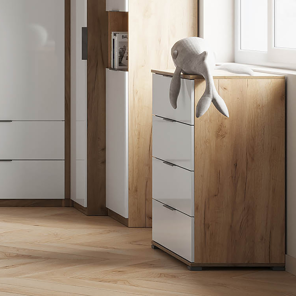 Цей комод має чотири ящики, що забезпечує достатньо місця для зберігання різних речей. Трикомпонентні кулькові телескопічні направляючі для повного висунення підвищеної міцності гарантують плавне і легке відкривання і закривання ящиків.