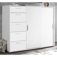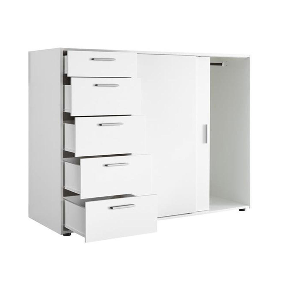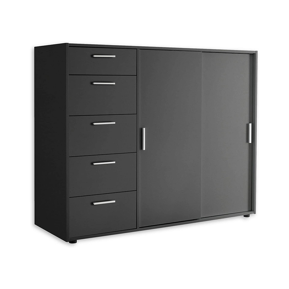 Комод має двоє дверцят і п'ять ящиків, що дозволяє зручно організувати зберігання різних речей – від білизни та одягу до книг та інших дрібниць. Комод оснащений телескопічними направляючими, що забезпечує легку і плавну роботу ящиків.