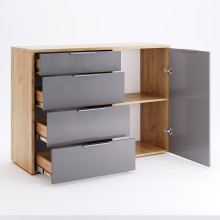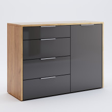 Корпус комода виготовлений з ламінованої ДСП товщиною 16мм, що гарантує його міцність і довговічність. Фасад виконаний з тришарового високоглянцевого покриття, яке пройшло ультрафіолетову обробку, що надає йому ефектний вигляд.