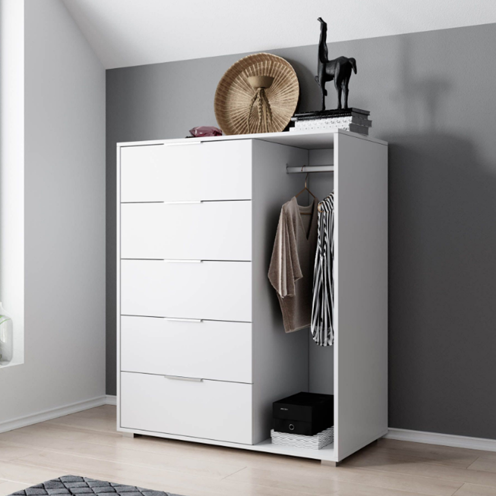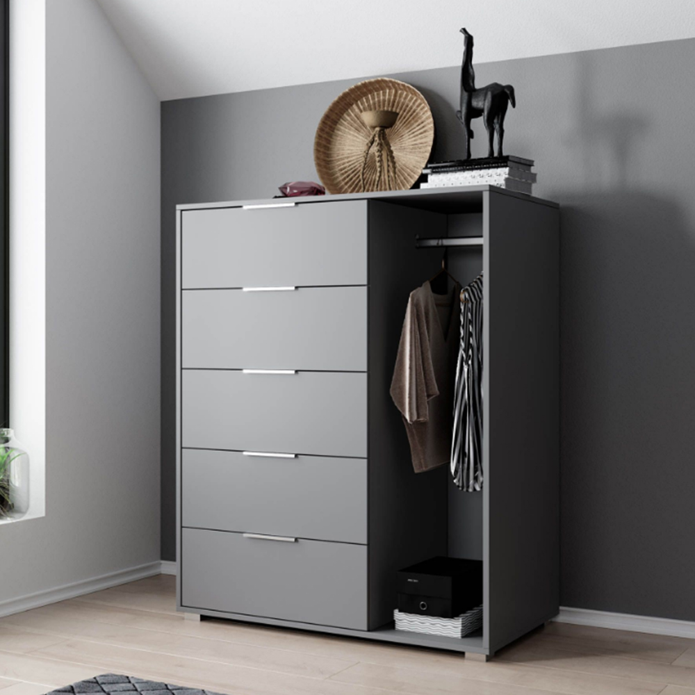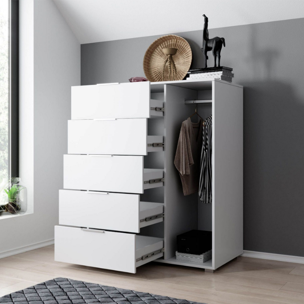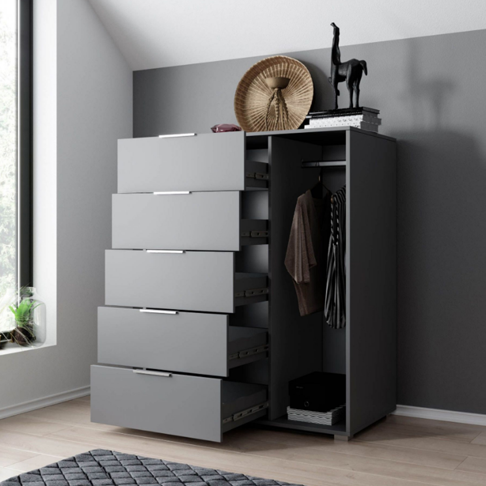 Комод має п'ять ящиків, що дозволяє розмістити ваші речі впорядковано і практично. Додатково комод оснащений нішею, яка створює можливість додаткового зберігання речей, які ви хочете мати під рукою або показати гостям.