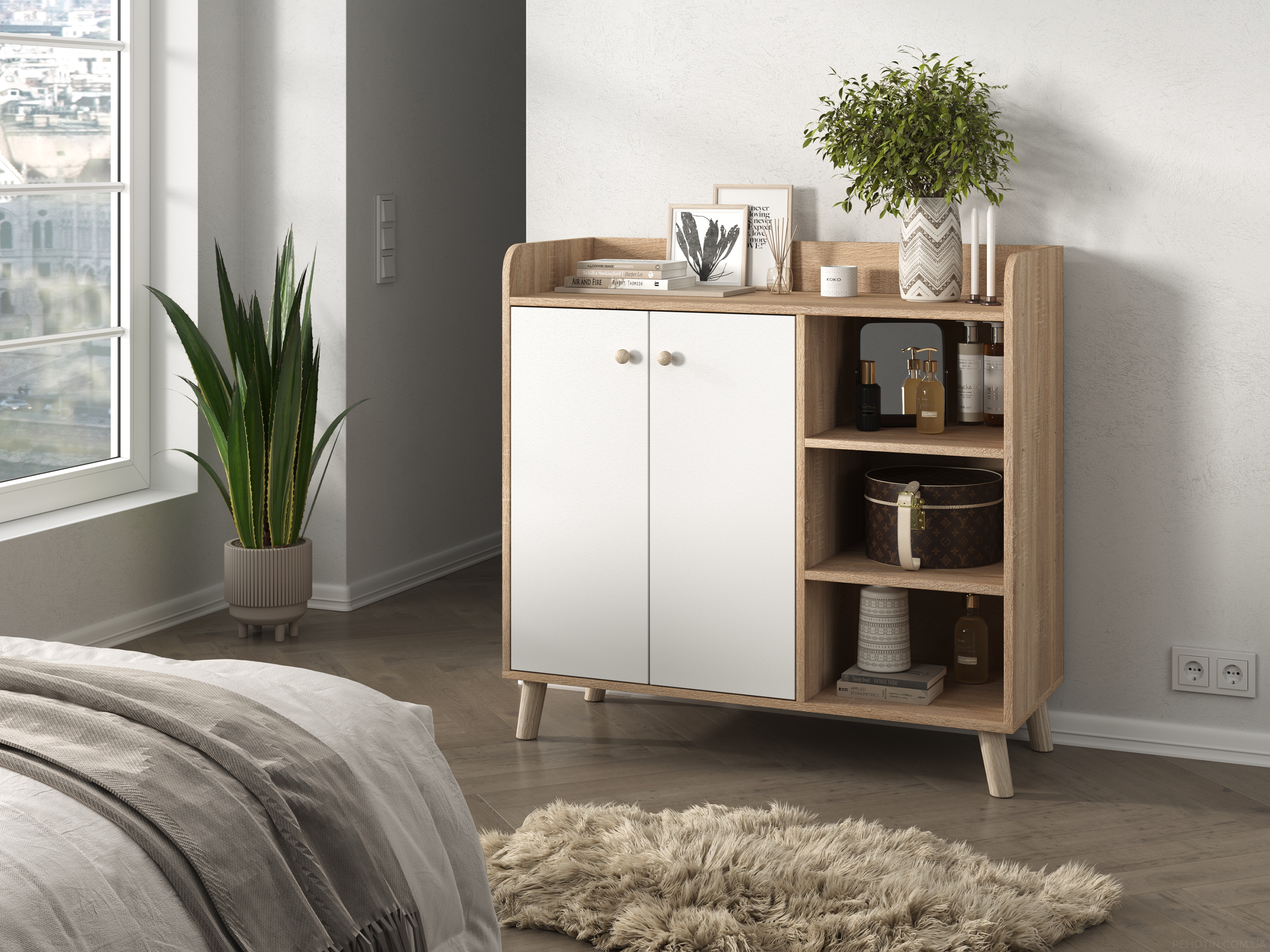 Комод до-2 Ретро має стильний і сучасний дизайн, який легко впишеться в будь-який інтер'єр. Ви можете вибрати один з п'яти доступних кольорів комода, які включають білий, дуб сонома, соному і білий, тахо і білий, бетон і білий.