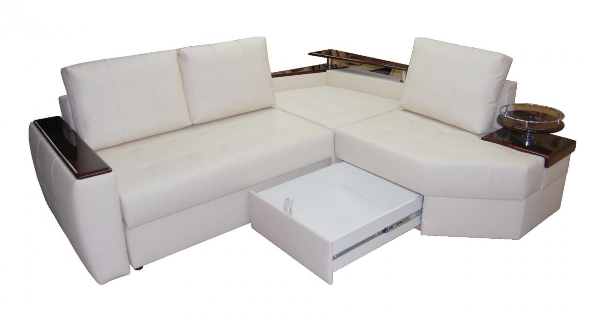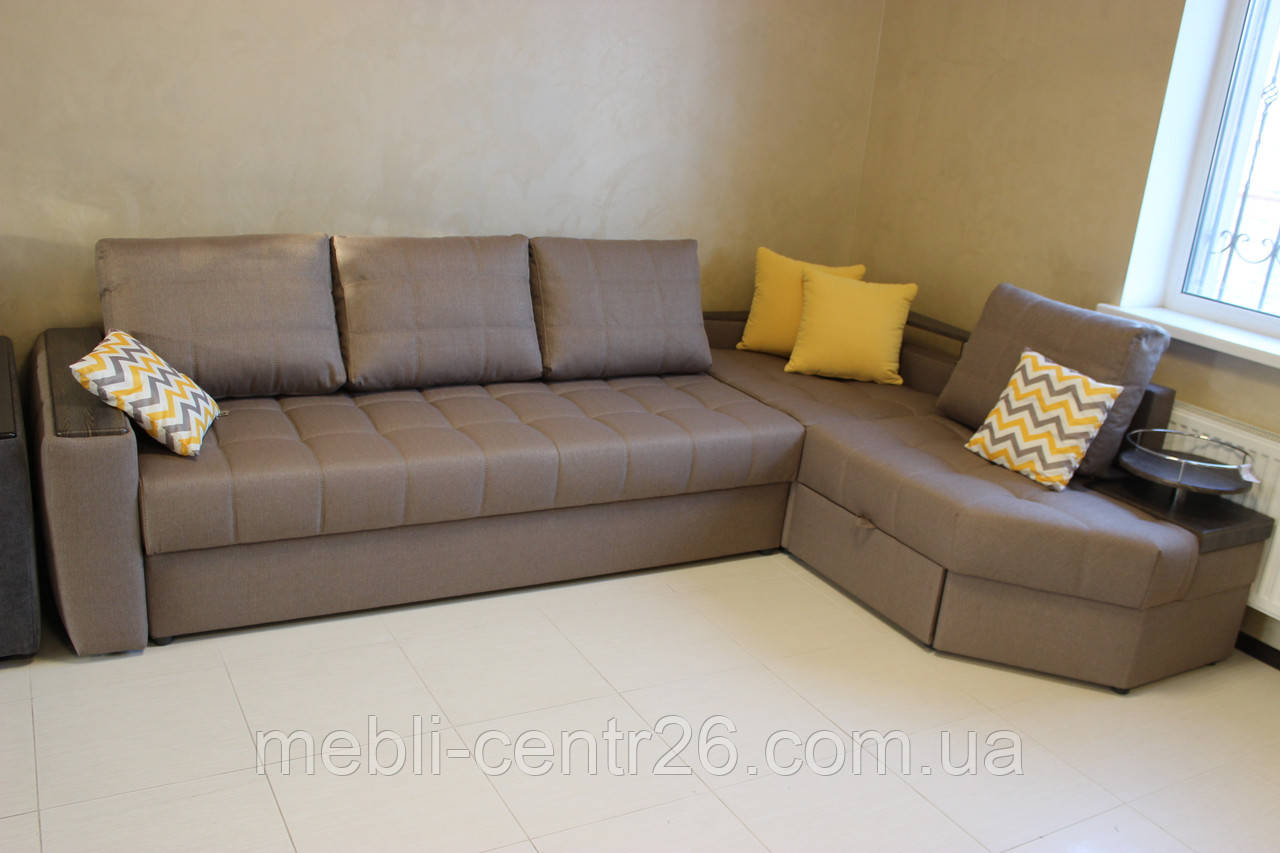 Зручне оснащення дивана включає короб для зберігання, де можна зберігати різноманітні речі, та полицю у кутовій частині для розміщення декоративних елементів або предметів першої необхідності. Декоративні елементи із МДФ надають дивану елегантності та шарму.