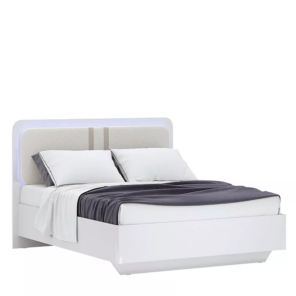 Корпус ліжка має біле глянсове покриття, а в головах вставка з бежевим фоном і двома вертикальними лініями. Ліжко виробляється в Україні і корпус виготовлений з ЛДСП матеріалу, а узголів'я – з ЛДСП з м'якими вставками.