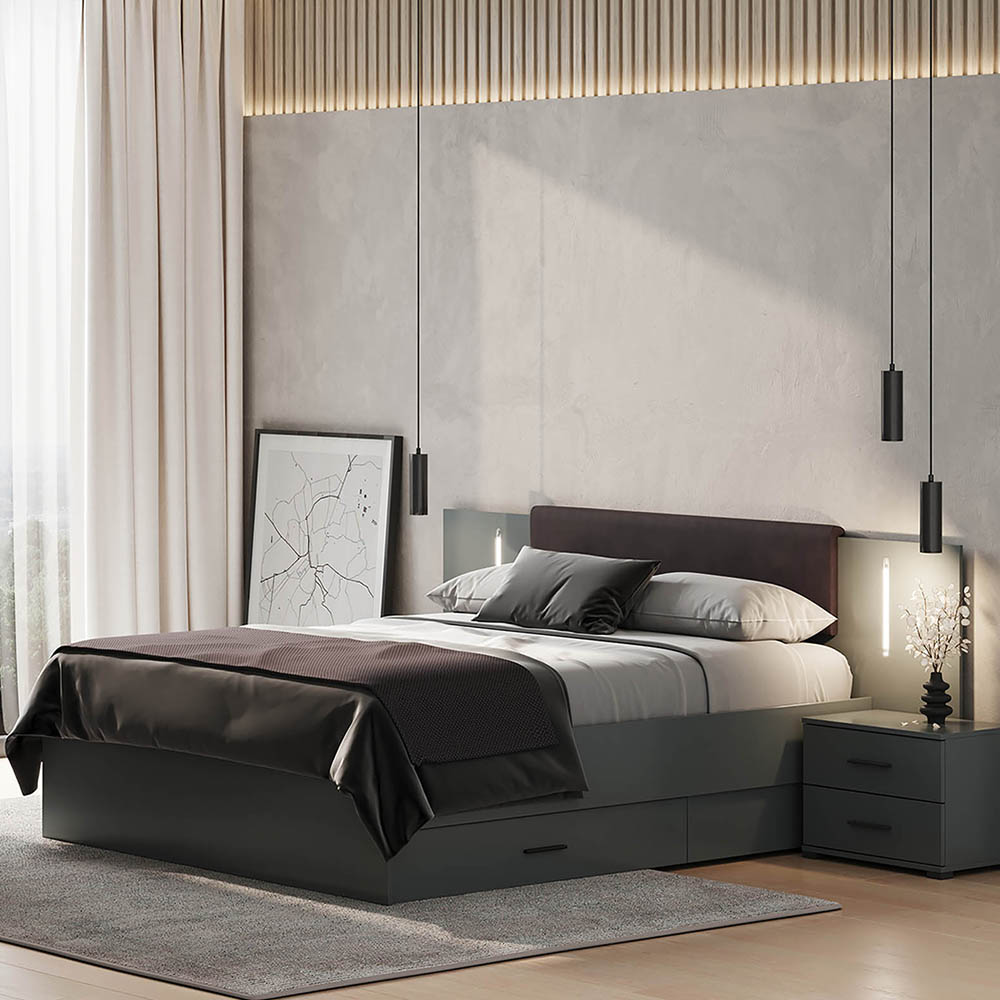 Ліжко має стильний і сучасний дизайн з графітовим матовим кольором, який надає елегантність і особливий шарм до будь-якого інтер'єру. Це ліжко також має високу задню спинку висотою 420 мм і загальну висоту 945 мм з урахуванням узголів'я, що забезпечує комфорт при сидінні або читанні в ліжку.