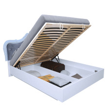 СТАНДАРТНЕ ВИКОНАННЯ ліжка включає металевий каркас з ламелями, крок яких становить 6,5 см.каркаси ліжка комплектуються гнутоклеєними буковими ламелями, що мають ширину 53 мм і товщину 8 мм. Колір велюру ліжка – світло-сірий.