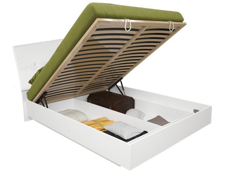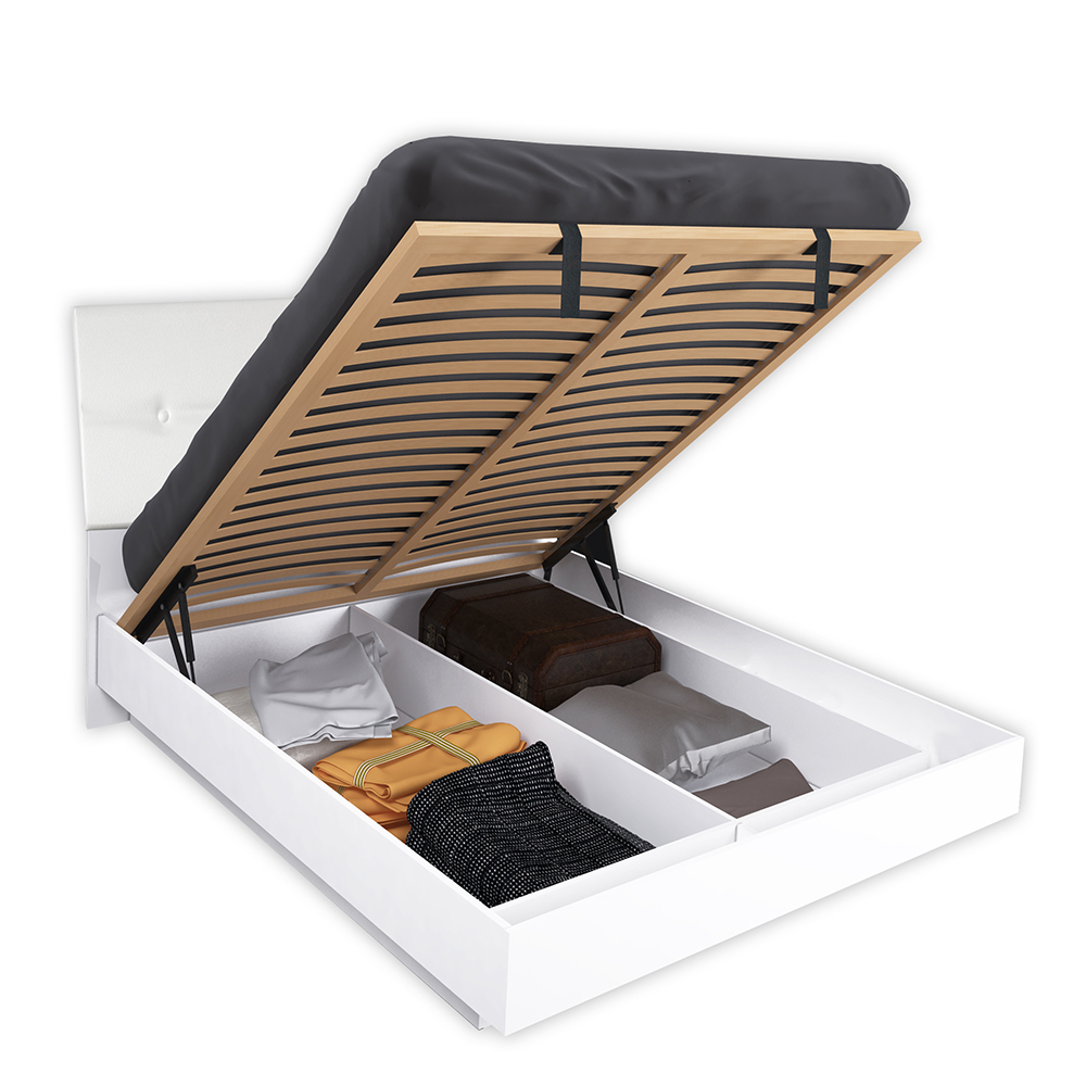 Матрац не входить в комплект, його необхідно купити окремо. Ліжко має нішу для зберігання білизни і підйомний механізм. Узголів'я виготовлено з матової екошкіри MADRIT 0920 на тканинній основі. Матеріал легкий у догляді і стійкий до перепадів температур.