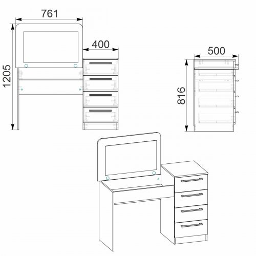 Висота трюмо може варіюватися в діапазоні від 720 мм до 1205 мм завдяки регульованій конструкції. Це надає вам можливість налаштувати висоту відповідно до ваших потреб і внутрішнього простору.