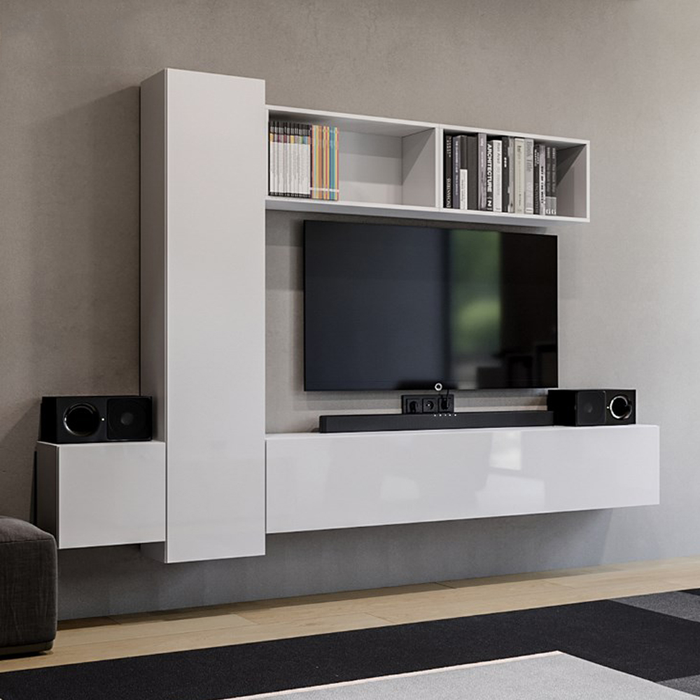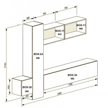 Цей набір вітальні включає шафи, полиці і тумби, які забезпечать достатньо місця для зберігання вашої побутової техніки, книг, аксесуарів та інших речей. Відкриття фасадів здійснюється системою Пуш-клік, що надає комфорт і легкість в їх використанні. Для легкого монтажу, в комплекті йдуть універсальні дюбель-гаки і регулювальні "вушка".