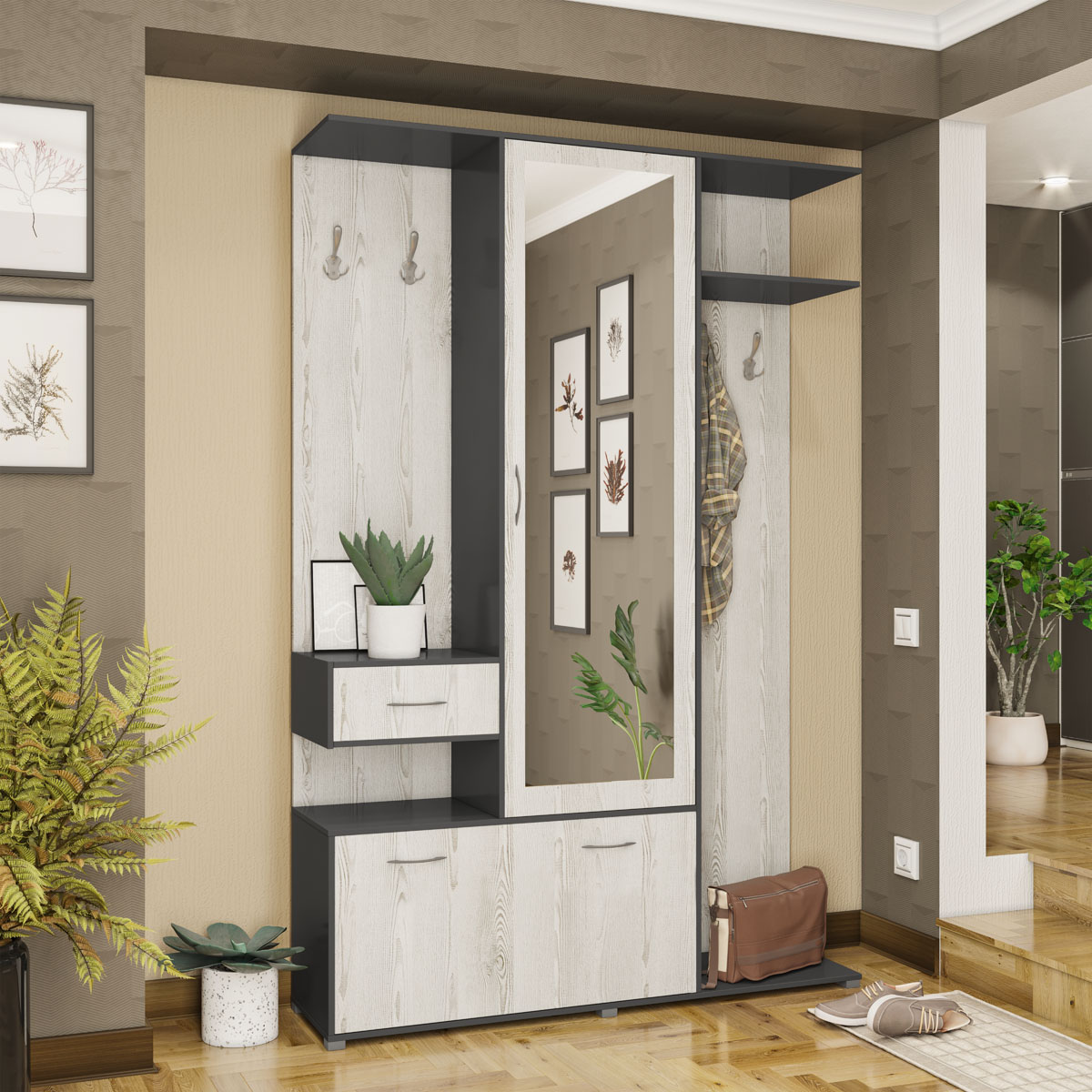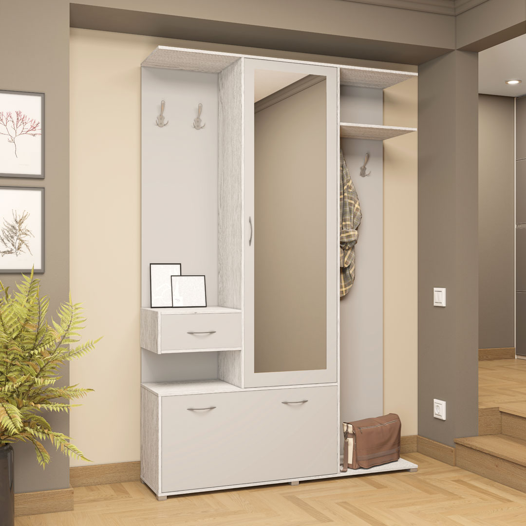 Корпус передпокою виконаний з артвуду світлого або антрацитового кольору, що надає йому елегантного та сучасного вигляду. Фасади також виконані з артвуду світлого або попелястого кольору, що створює стильний контраст і надає кімнаті затишку та тепло.