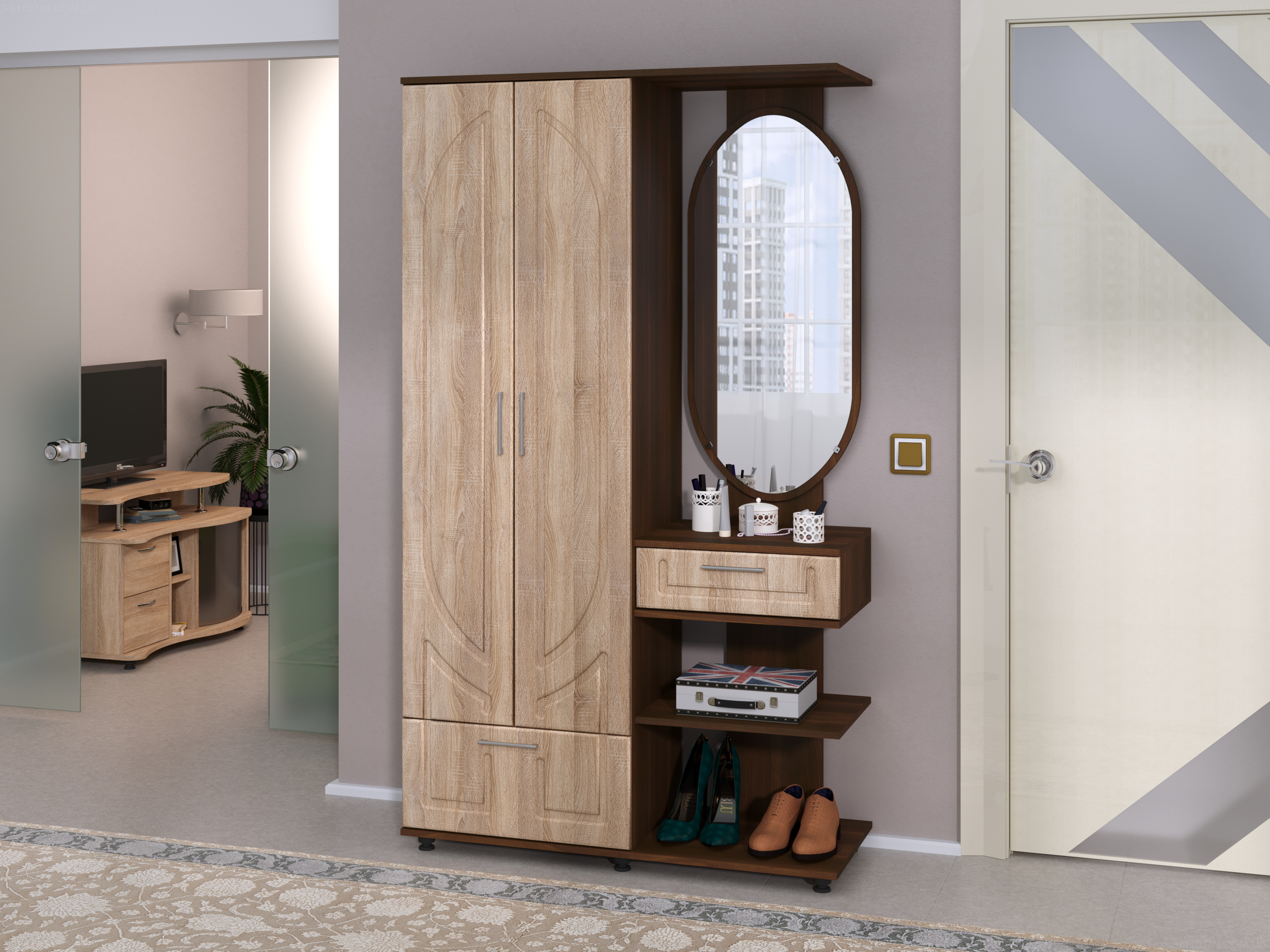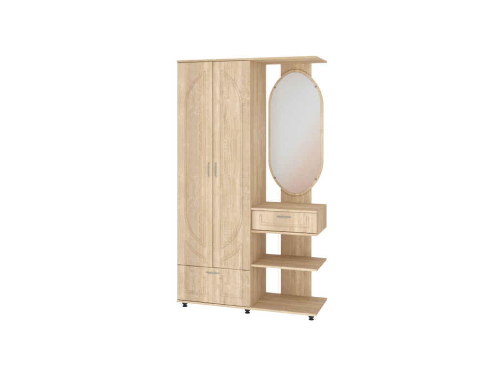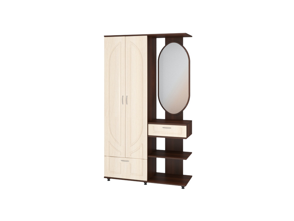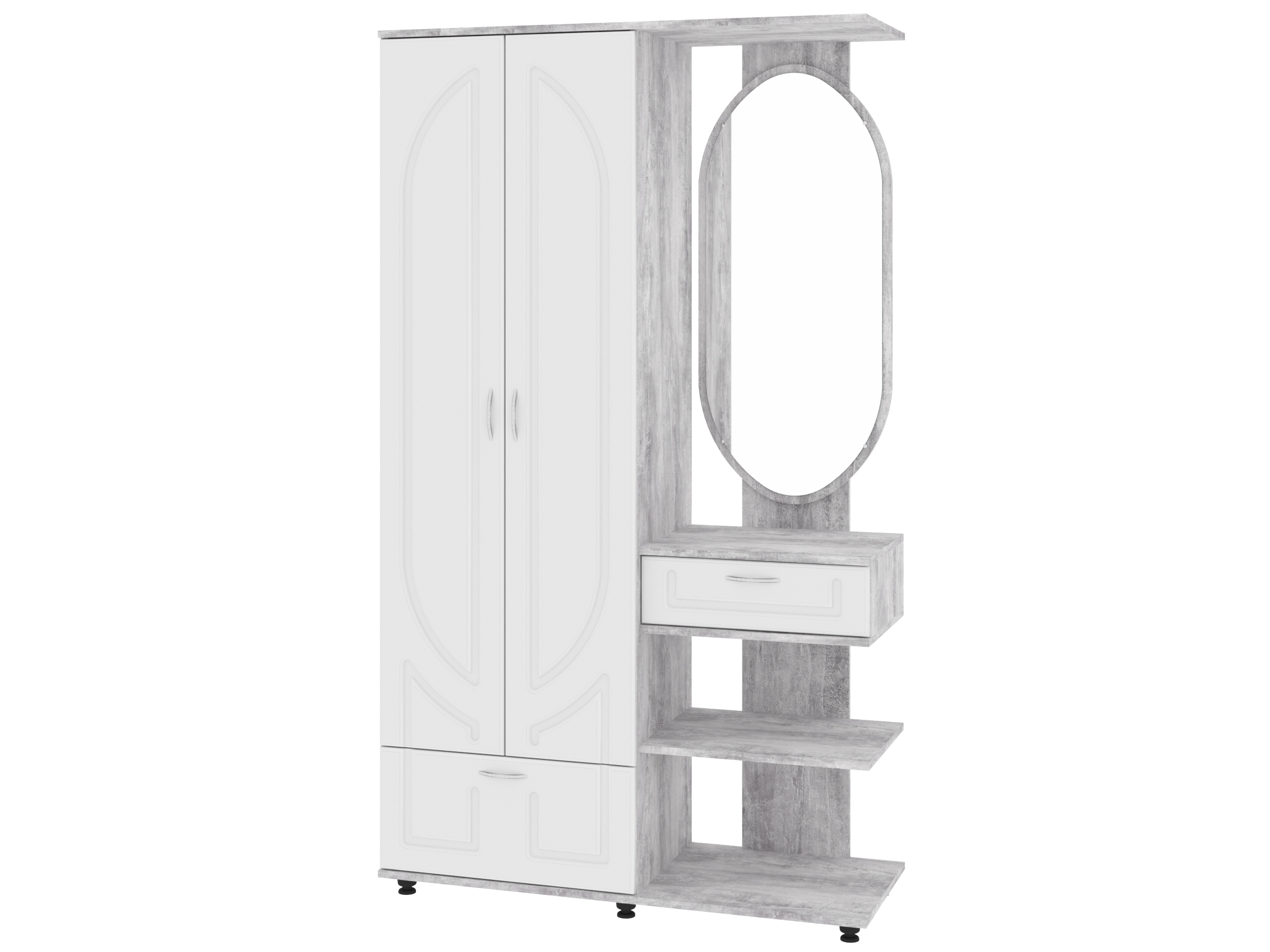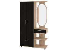 Цей передпокій має ретельно продуману конфігурацію для ефективної організації вашого вхідного простору. Вона включає різноманітні полиці, Вішалки, висувні ящики і велике дзеркало. Це надає вам зручність для зберігання верхнього одягу, взуття, головних уборів і аксесуарів. Велике дзеркало на внутрішній стороні дверцят дозволяє вам перевірити свій вигляд перед виходом. Дверцята обладнані роликовими напрямними для легкості відкривання і закривання.