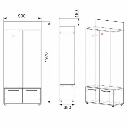 Завдяки своїм розмірам, висоті 2000 мм, ширині 900 мм і глибині 380 мм, цей передпокій ідеально підходить для невеликих приміщень, де кожен сантиметр має значення. Вона дозволить вам оптимально використовувати обмежений простір для зберігання вашого одягу, взуття та інших предметів.