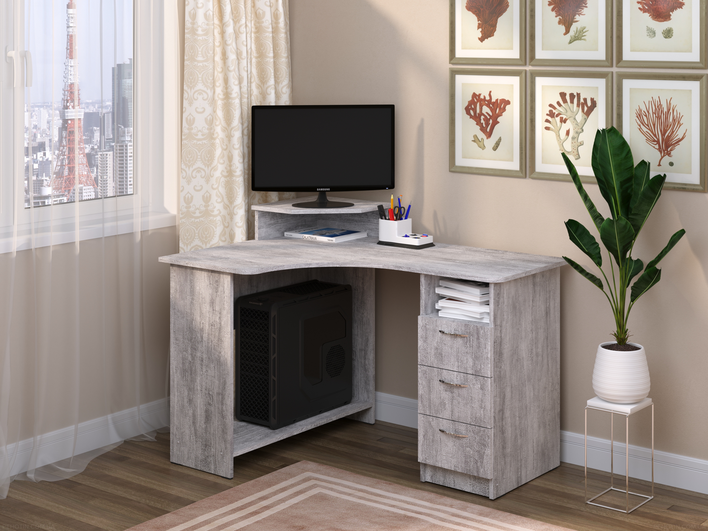 Компактний комп'ютерний стіл Компакт-ідеальне рішення для тих, хто шукає простий і функціональний стіл для роботи з комп'ютером і оргтехнікою. Завдяки своїм компактним розмірам і сучасному дизайну, цей стіл легко вписується в будь-який інтер'єр і дозволяє оптимізувати робочий простір.
