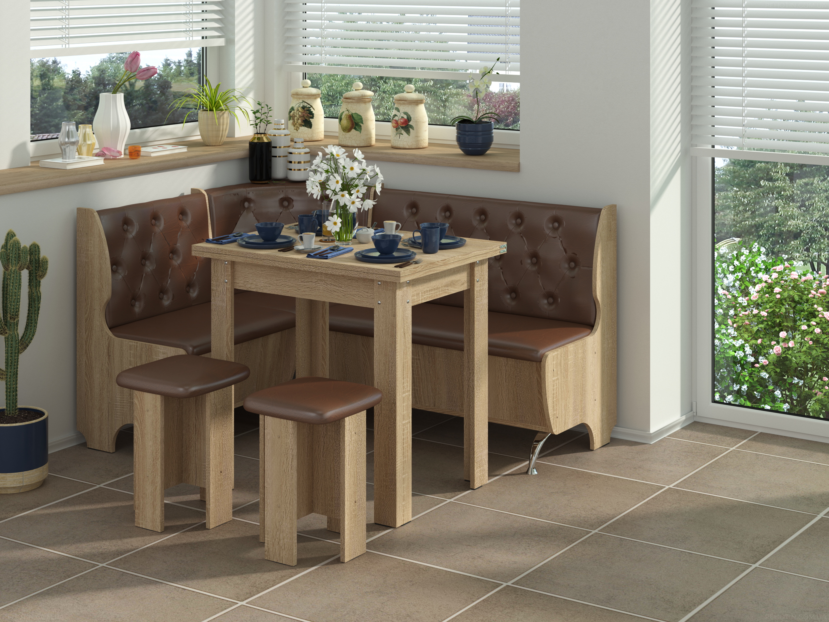 Куточок не має підлокітників, що додає йому легкості і дозволяє вам вільно розміщуватися на ньому. У той же час, наявність ящиків для зберігання різних кухонних дрібниць робить його функціональним. Ящики дозволяють організовано і зручно зберігати різні предмети і додатковий посуд.
