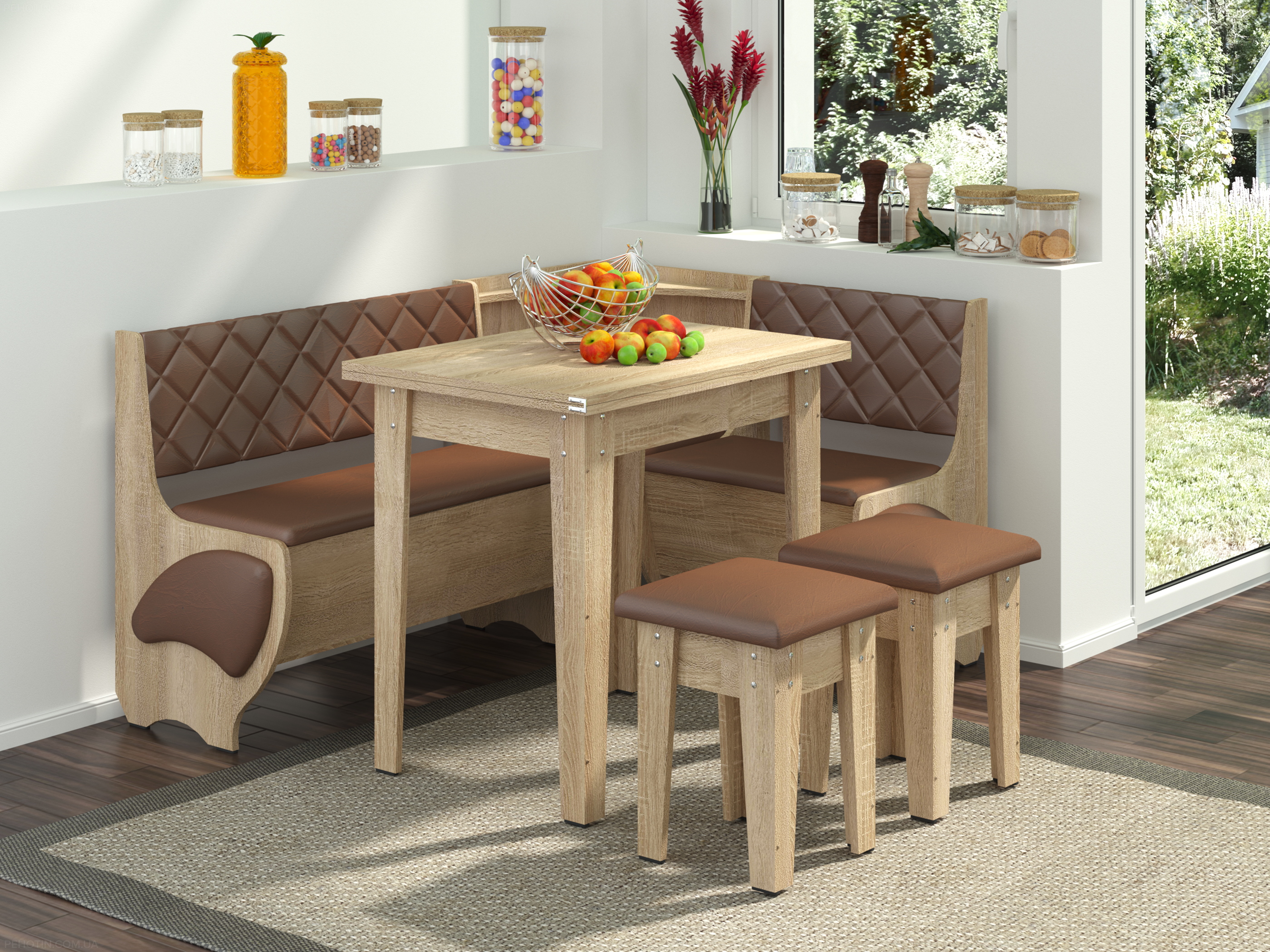 Цей куточок дозволяє вам комфортно розміститися під час сніданків, обідів і вечерь. Наявність ніші під сидінням дає можливість зберігати різноманітні кухонні прилади та інші необхідні предмети.