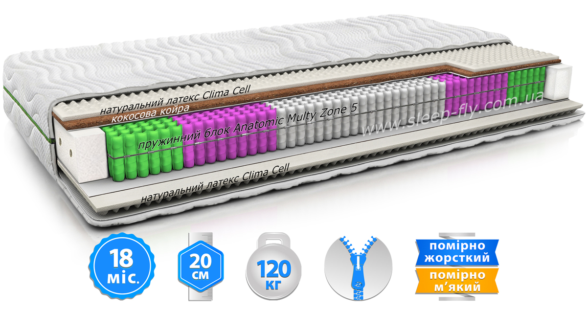 Матрац розрахований на навантаження до 120 кг, що робить його чудовим варіантом для різних користувачів. Використання високоякісних матеріалів, таких як кокосова койра та латекс гарантує довговічність та ефективний відсік вологи.
