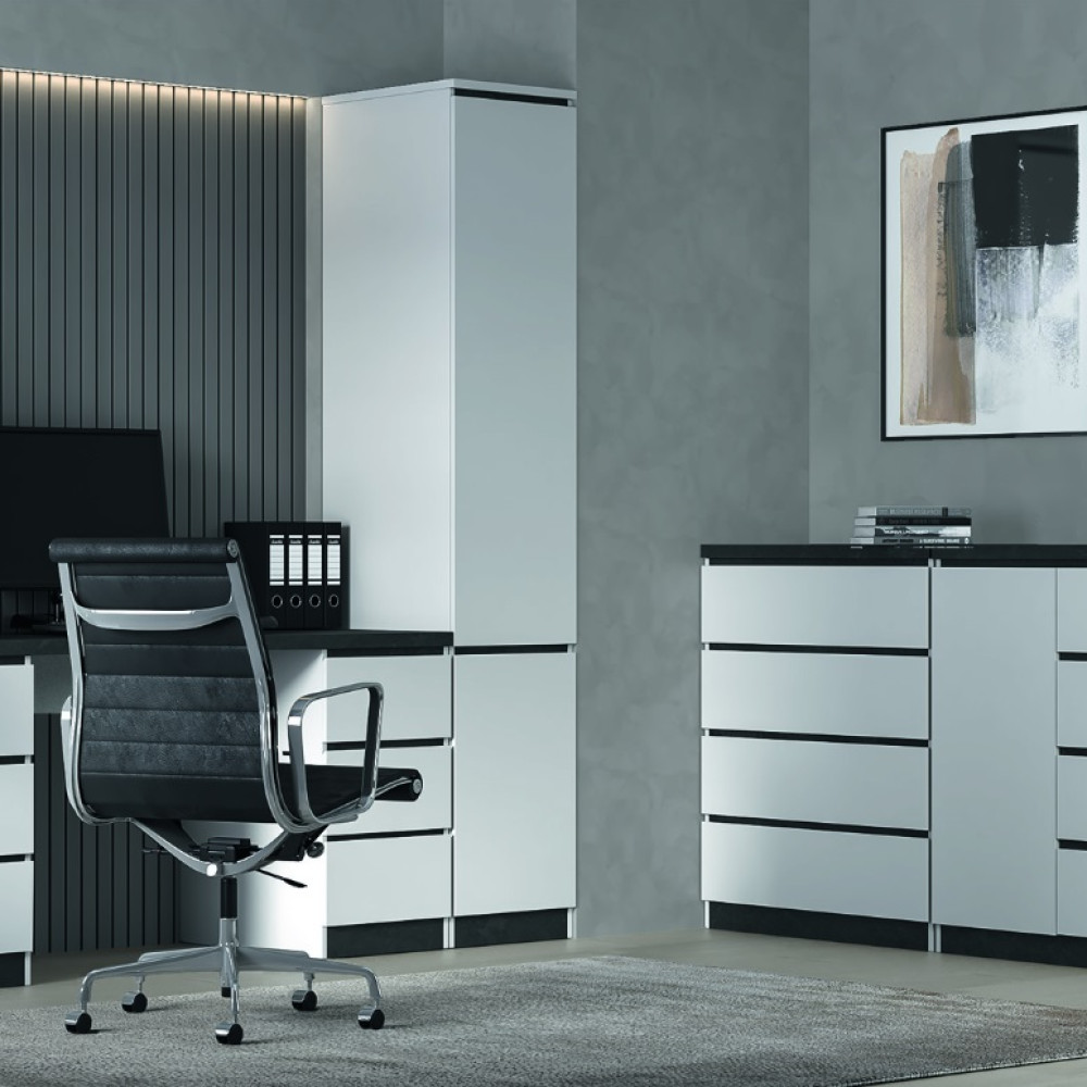 Пенал Мія 2Д відрізняється високим зчепленням із поверхнею. Дверцята захищає вміст від пилу та забруднень, а великі внутрішні простори дозволяють організувати речі зручно та логічно. Опціонально можна додати додаткові полиці, ящики або висувні системи для більшої функціональності.