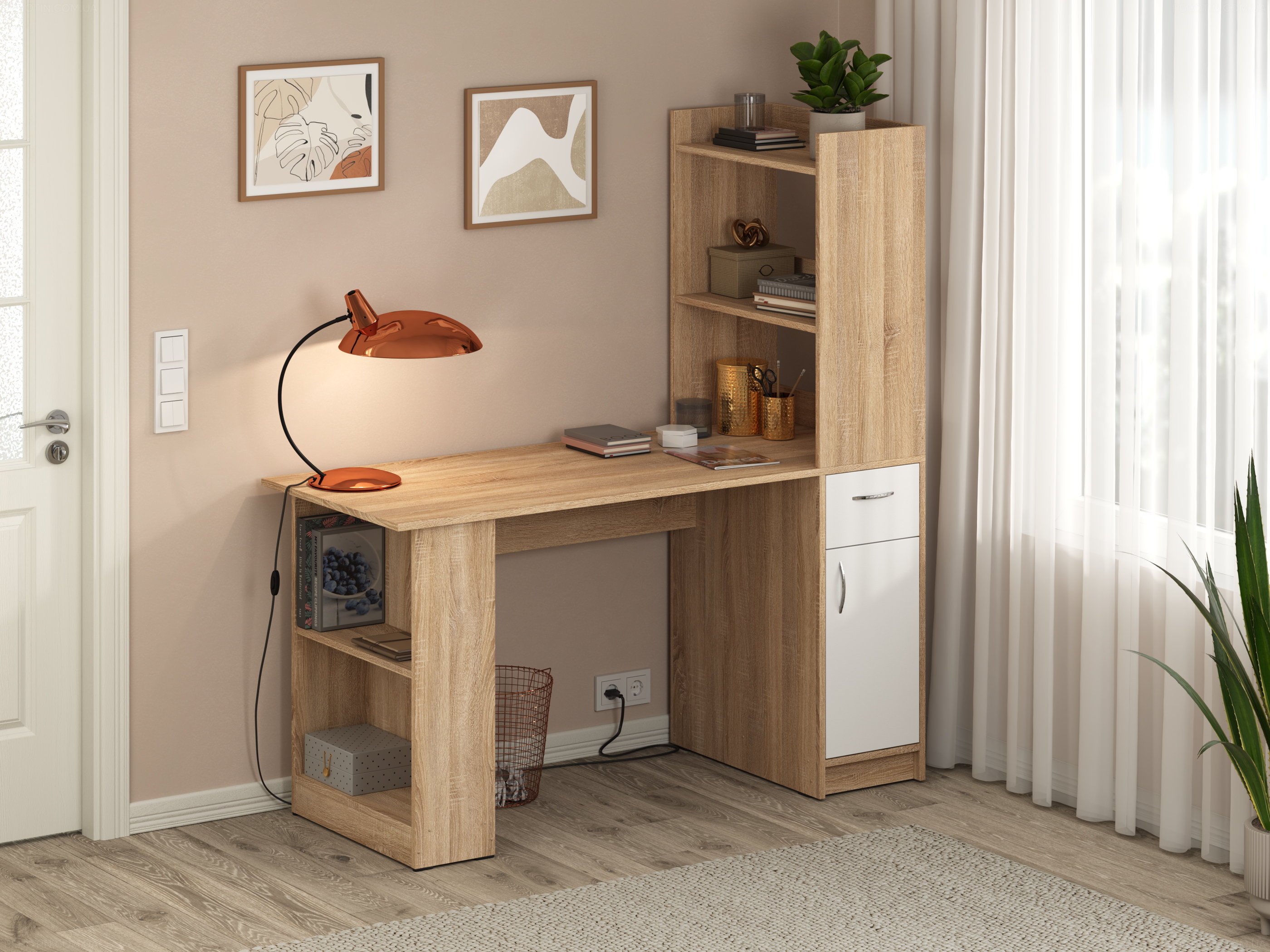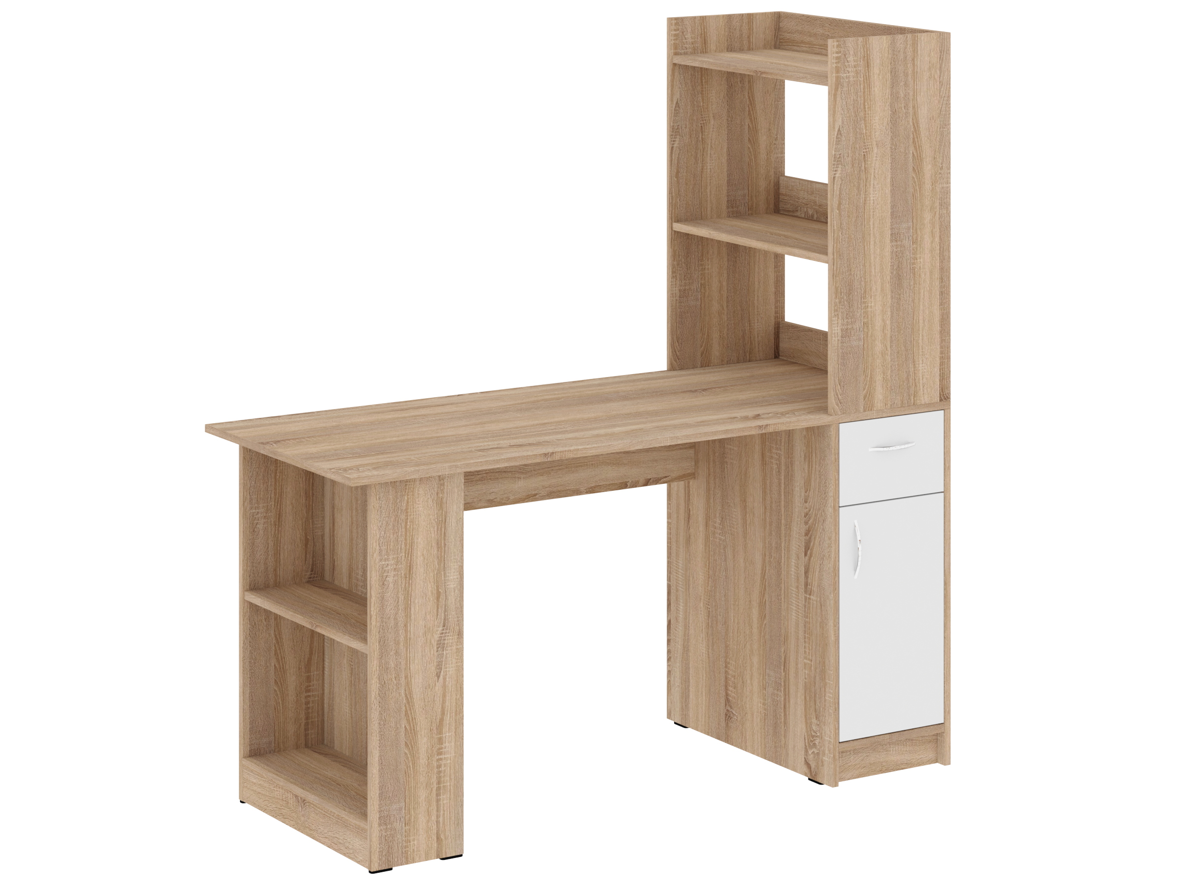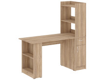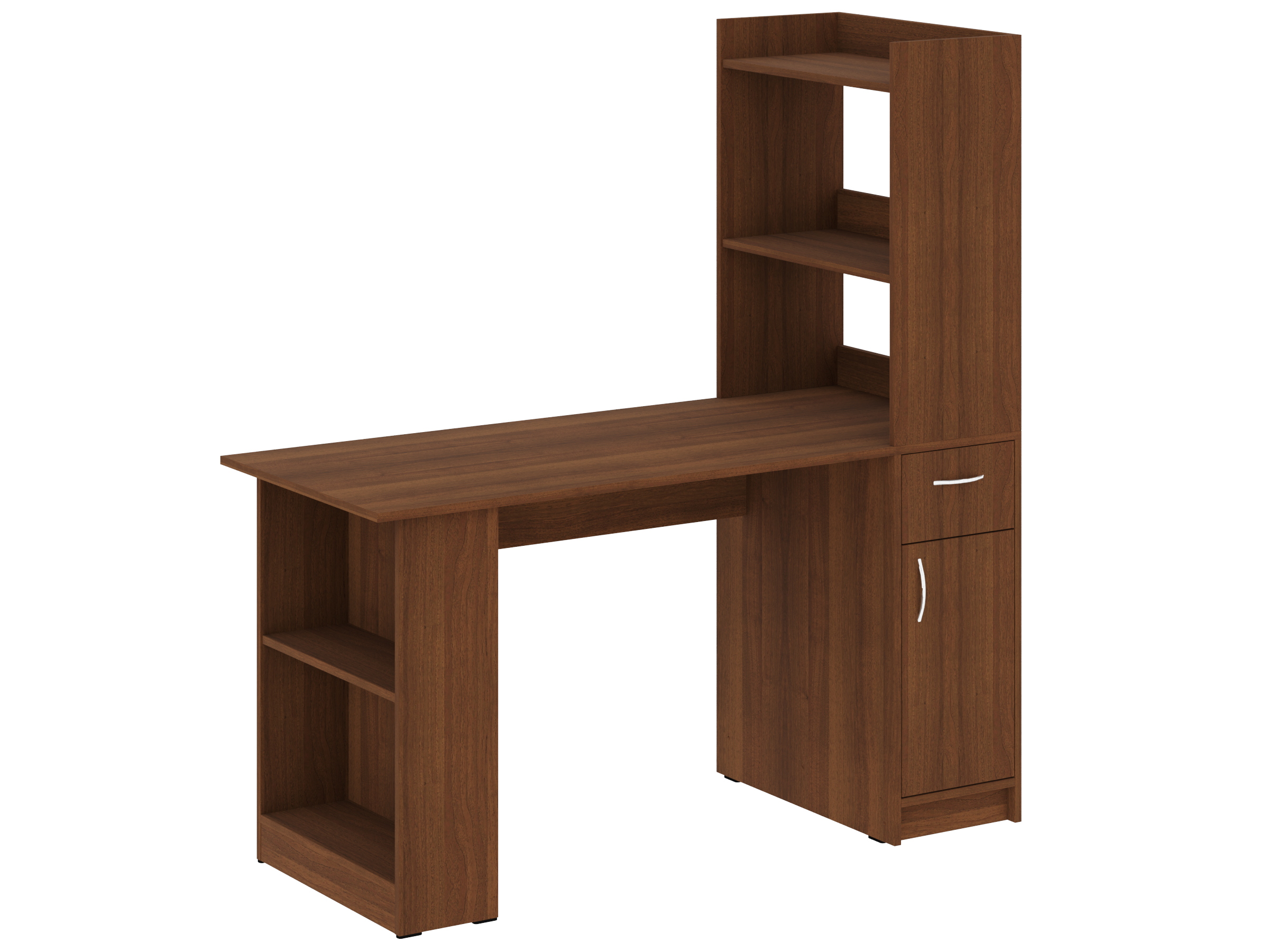 Ця модель складається з письмового столу з тумбою, надбудовою і відкритими полицями з торця столу зліва. Довга стільниця дозволяє комфортно працювати за комп'ютером або ноутбуком, маючи всі необхідні документи і зошити під рукою. Тумба містить висувний ящик і закрите відділення, розділене полицею, де можна зручно зберігати канцелярські Прилади та архівні документи. Надбудова розташована нестандартно, поперек стільниці з правого боку, що надає столу здоровий зовнішній вигляд і приховує речі, розміщені на ній.