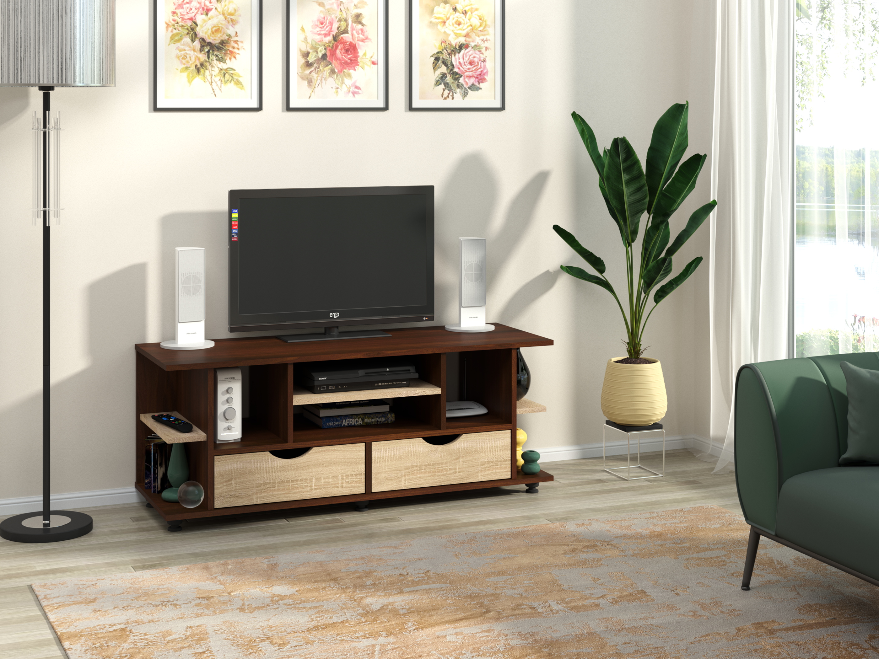 Загальне враження від цієї телевізійної тумби-це сучасний і стильний дизайн, Висока якість виготовлення і уважність до деталей. Вона створена для того, щоб надавати вашому інтер'єру особливий шарм і комфорт, забезпечуючи надійне і стильне місце для вашого телевізора та інших мультимедійних пристроїв.