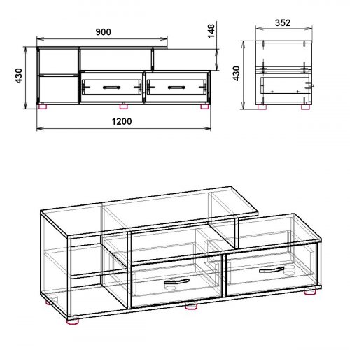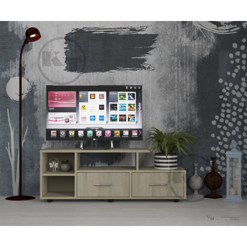 Ширина: 1200 мм. велика ширина тумби забезпечує достатньо місця для розміщення не тільки телевізора, але й іншої аудіо - та відеоапаратури, книг, декоративних елементів і багатьох інших речей.
